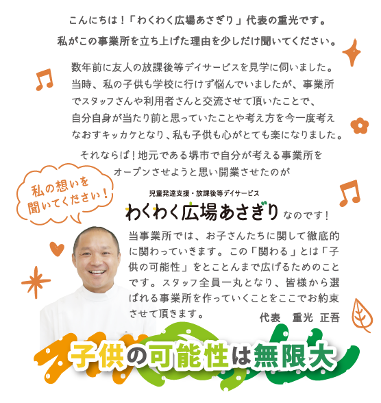 | サービス提供時間 | 児発・放デイ (平日) 11:00~18:00 (休日) 10:00~16:30 |